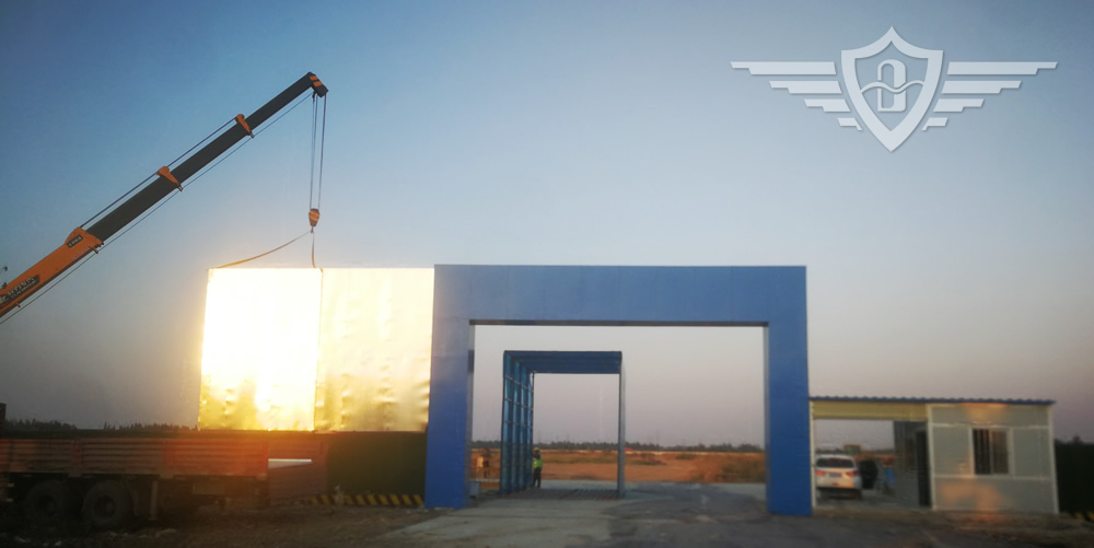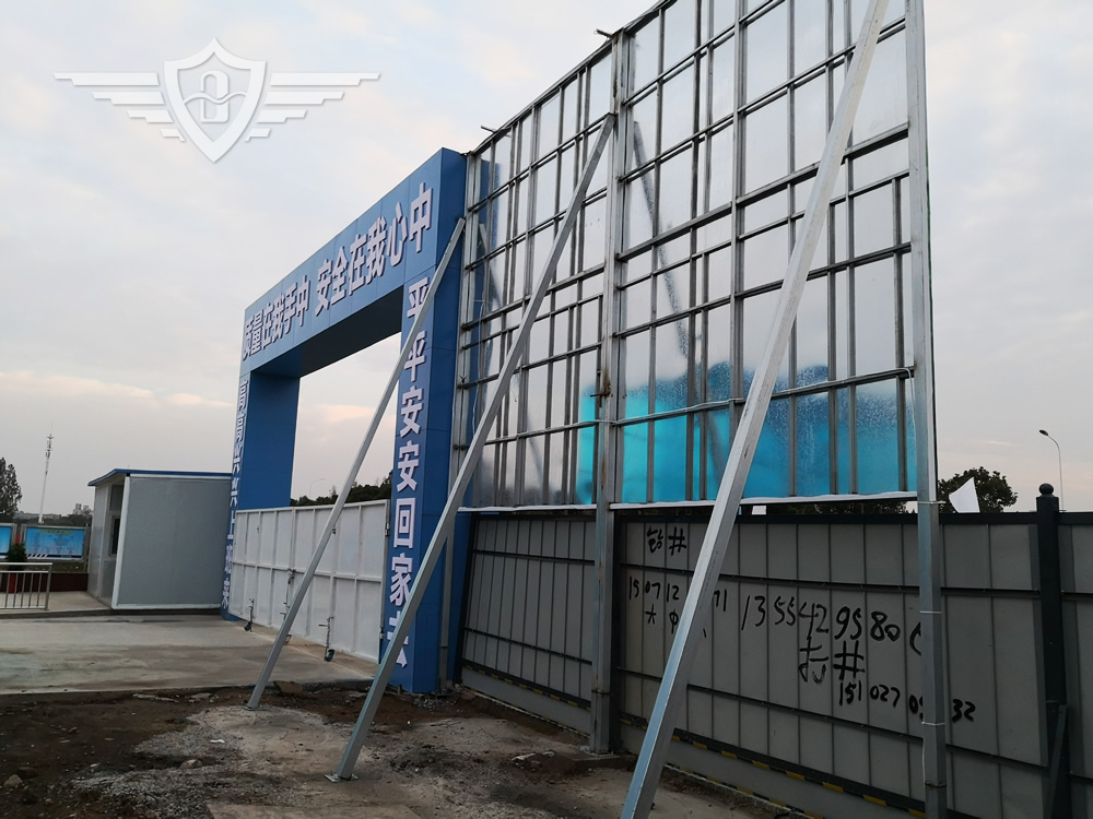四扇大门+几字门框+鸟瞰图框架+值班室+人脸识别+翼闸+卷闸门+翼闸旁小门和门禁